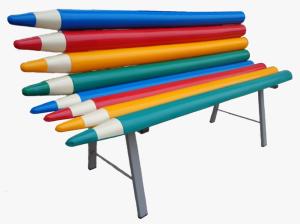 Banco em forma de Lápis para 3 crianças. Composição: estrutura de metal e as réguas de plástico colorido com pontas em forma de lápis.